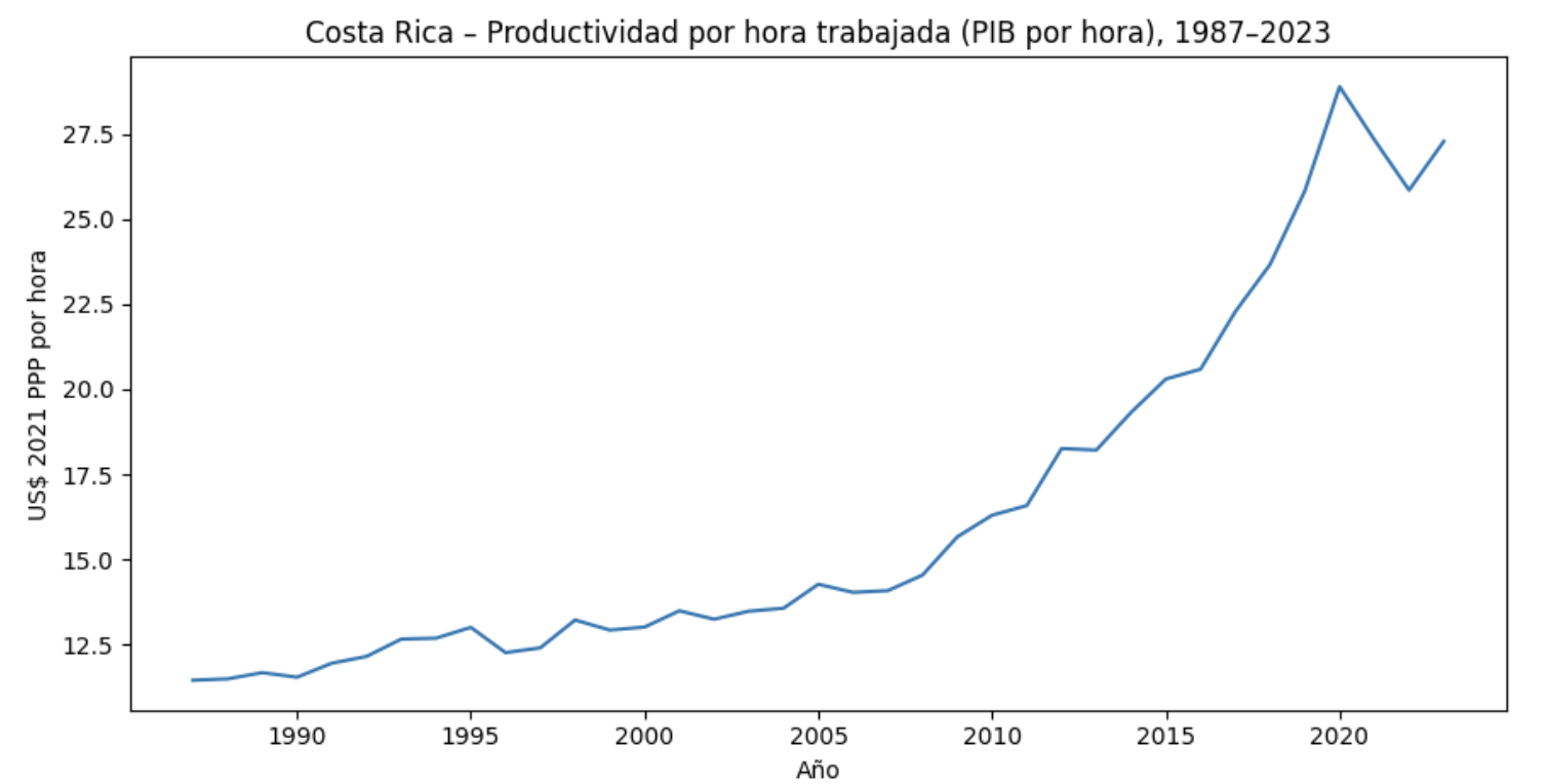 Figura 3. Productividad por hora trabajada (PIB real por hora, PPP 2021), 1987–2023