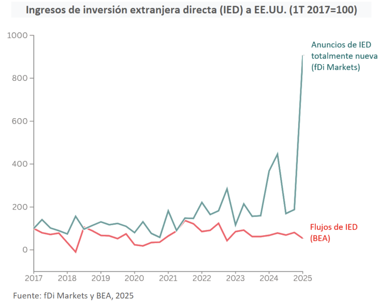 Las dos series de datos comenzaron a divergir tras la pandemia de COVID-19, ya que las políticas industriales implementadas por la administración anterior incentivaron a las empresas a anunciar grandes planes de inversión y, por lo tanto, a acceder a incentivos públicos. En esta ocasión, las multinacionales de todos los sectores se han apresurado a demostrar su compromiso con EE.UU. para ganarse el apoyo de la administración Trump. Aunque por diferentes razones, las cifras aún pueden parecer infladas. Las expectativas sobre la IED en EE.UU. no se corresponden con la realidad: